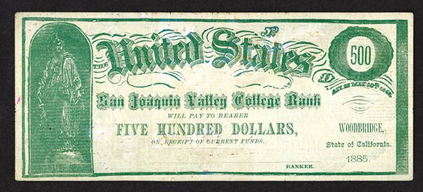 California. 500 Dollars. Freedom at left end. Remainder, unsigned, unnumbered. Very Fine, some spots on green back.