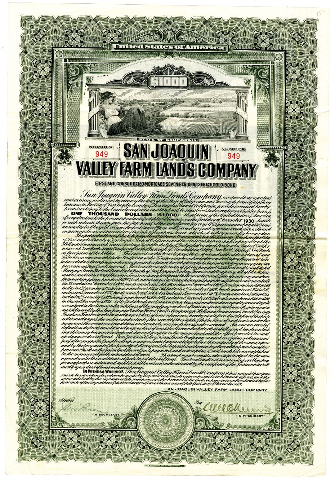 California, 1921. $1000 I/U 7% First and Consolidated Mortgage Serial Gold Bond, Black text with gray border and undertint, Allegorical woman with farm in distance at top center. Fine condition, JBN.