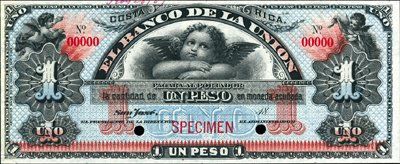 18--;(ca.1886-89). P-S221 Unlisted. 1 Peso Specimen banknote. Red specimen overprint, POC and "00000" serial numbers. Archival ink notations on top margin and paper remnants on back right margin from previous mounting, otherwise appears AU+ to Unc. ABNC.
