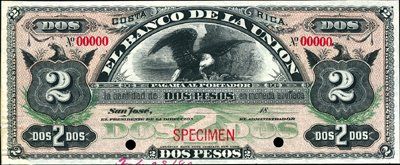 18--;(ca.1887-89). P-S222 Unlisted. 2 Peso Specimen banknote. Red specimen overprint, POC and "00000" serial numbers. Archival ink notations on bottom margin and paper remnants on back right margin from previous mounting and one pin hole in the upper right corner, otherwise appears AU+ to Unc. ABNC.