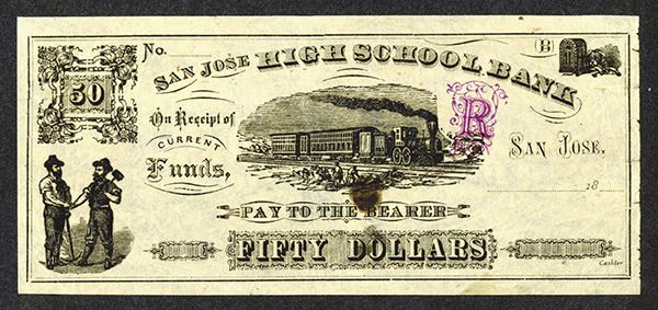 San Jose, California. 50 Dollars. Steam train at center, miners at lower left. Unsigned, undated, "R" hand stamp at right center. Large "L" on back. Fine to Choice Fine with minor edge faults on the right margin. Rare Business School currency.