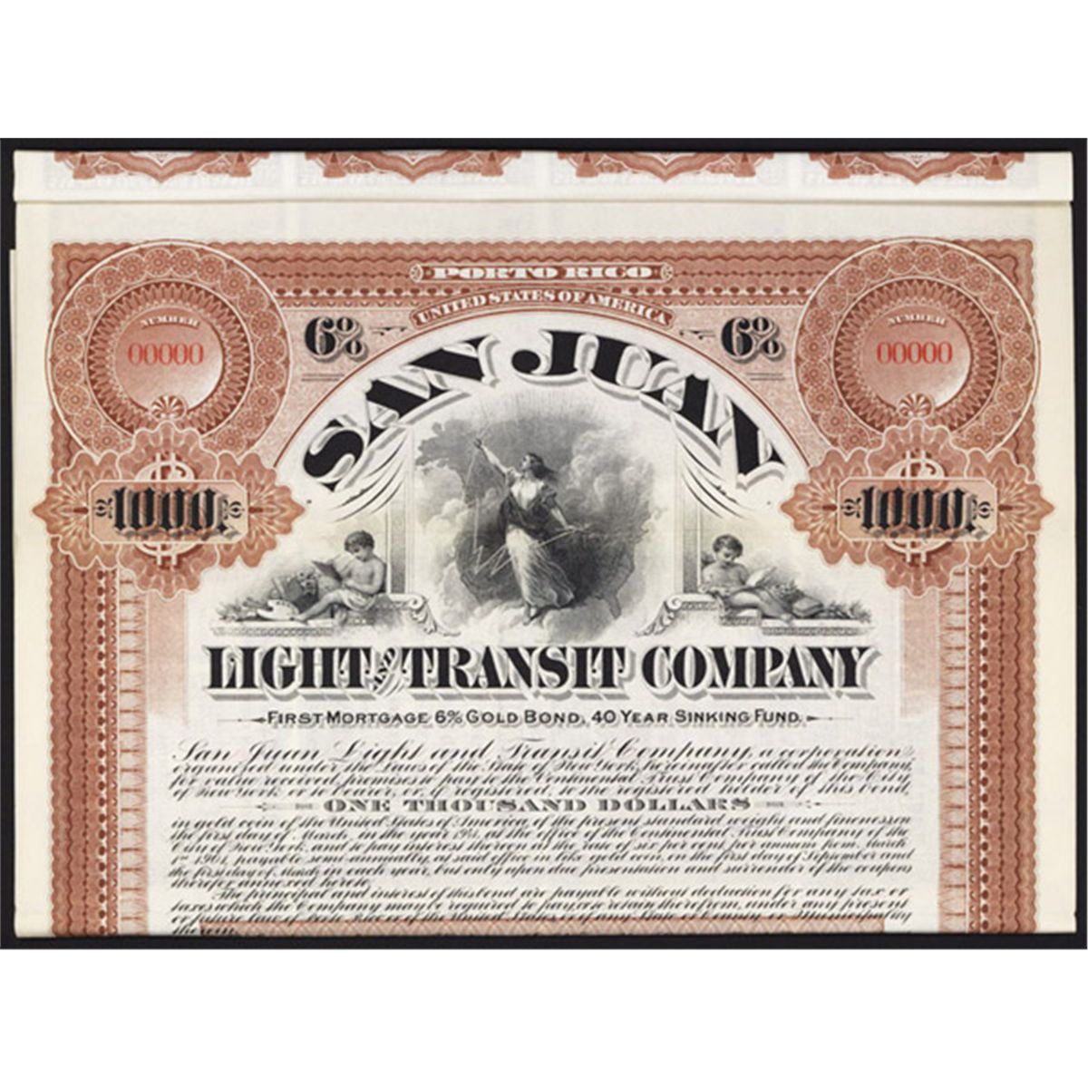 Porto Rico, 1901, Horizontal $1000 first mortgage 6% gold bond, 40 year sinking fund specimen with coupon attached, Brown border with allegorical woman flanked by Cherubs, specimen overprints, POCs, ABNC, Rare and early Puerto Rico specimen bond.