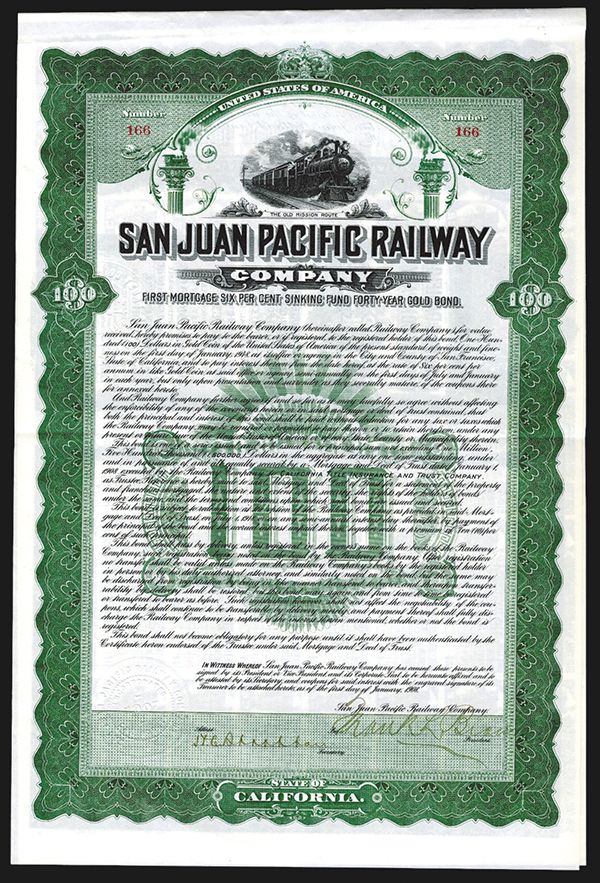 San Juan Pacific Railway Co., 1908 1st Mortgage 6% Gold Coupon Bond. vignette of a train ( SJPRR No. 208 ) above the words " The Old Mission Route". The San Juan Pacific Railway was operative May 4, 1907 and provided rail service from the San Juan Portland Cement Plant to the Southern Pacific at Chittenden. The San Juan Pacific Railway was operating a seven mile line, the Mission Route, to San Juan Bautista. They planned on expanding their line to Salinas, Hollister and Watsonville.