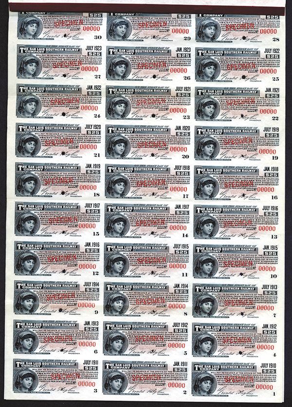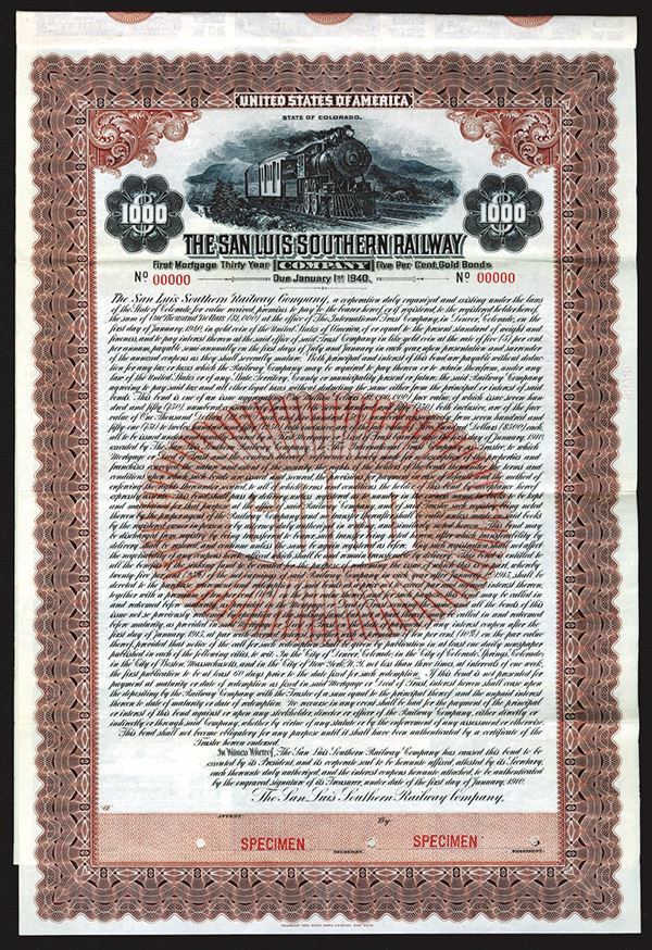 Colorado, 1910, $1000 1st Mortgage 30 Year 5% Gold Specimen Bond, Black printing with brown border and underprint, Moving locomotive top center, POC's and red SPECIMEN overprints, VF-XF condition, FLBNC. Railroad not listed in Cox.
