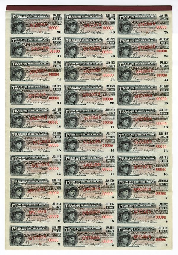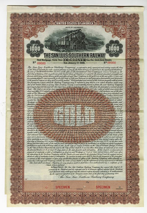 Colorado, $1000, Specimen, 1st Mortgage, 5 % Gold Coupon Bond. Black with brown border and under print, locomotive traveling in countryside with mountains behind, Red specimen overprints, POC's and "00000" serial numbers. XF condition. Rare Colorado railroad bond and only known as a Specimen in Cox. ABNC. 3 were found in the archives.