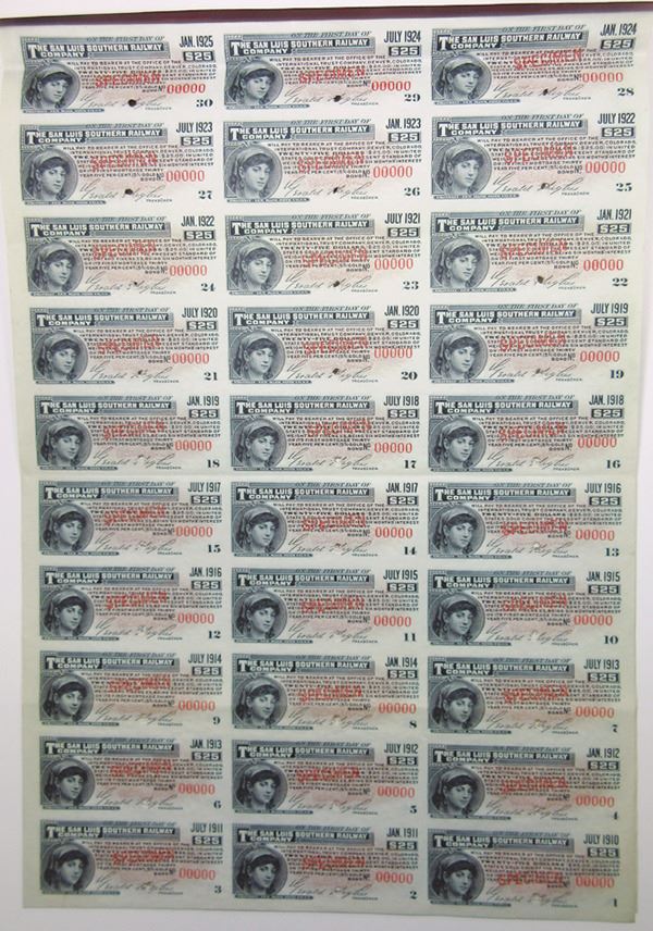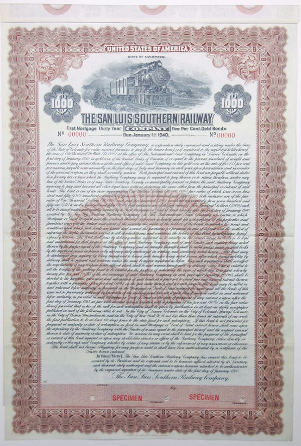 Colorado, 1910, $1000, Specimen, 1st Mortgage, 5 % Gold Bond. Black with red brown border and underprint, locomotive traveling in countryside, Coupons attached. Red specimen overprints, POC's and "00000" serial numbers. XF condition. Rare Colorado railroad bond and an unlisted railroad in Cox. ABNC.