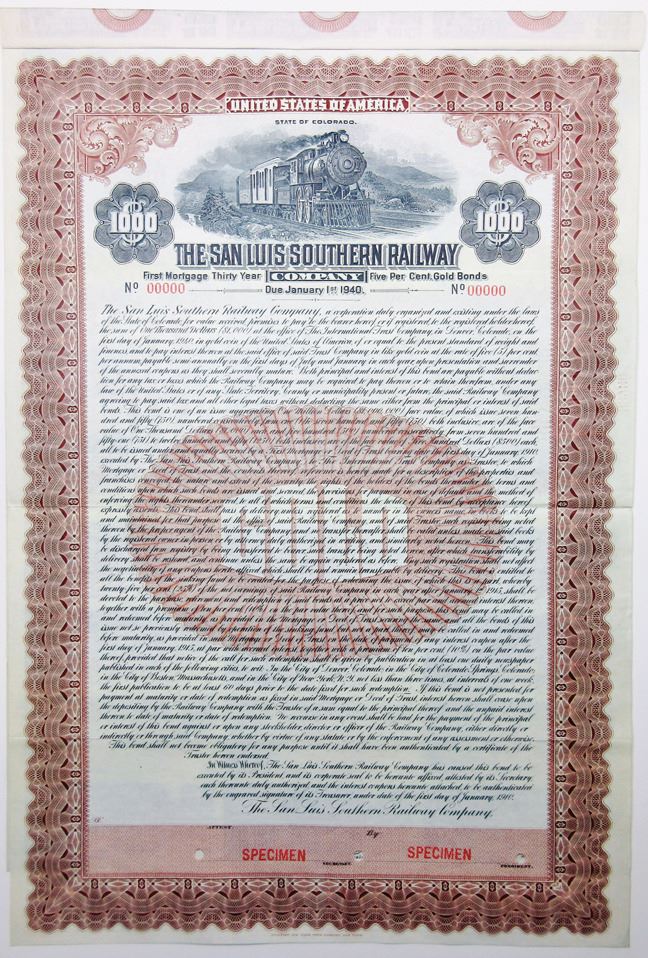 Colorado, 1910, $1000, Specimen, 1st Mortgage, 5 % Gold Bond. Black with red brown border and underprint, locomotive traveling in countryside, Coupons attached. Red specimen overprints, POC's and "00000" serial numbers. XF condition. Rare Colorado railroad bond and an unlisted railroad in Cox. ABNC.