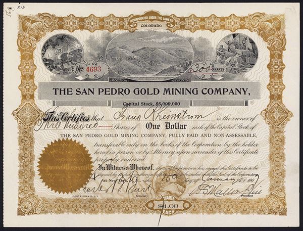 Colorado, 1907, 300 Shs., Issued and uncancelled, Mountains and miners, staple hole, otherwise XF.