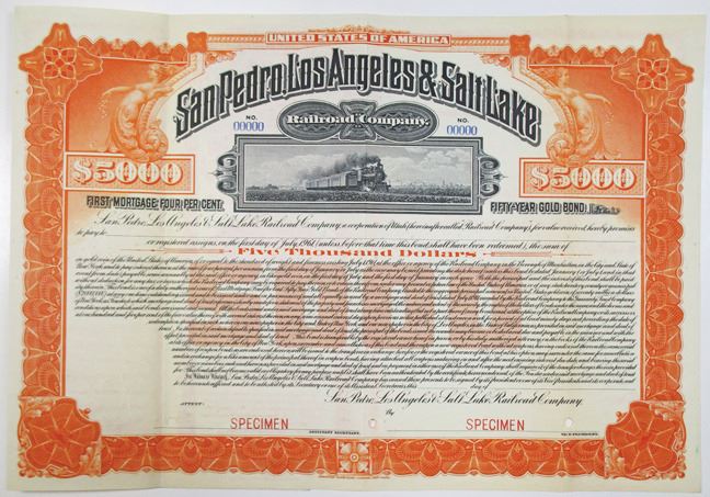 Utah, 1911. $5000 Specimen 4% First Mortgage Gold Bond, Black text with orange border and underprint, Train passing from left to right at top center. Red specimen overprints, 00000 serial numbers, and POCs. VF condition, ABNC. Unlisted color in Cox, Rare specimen.