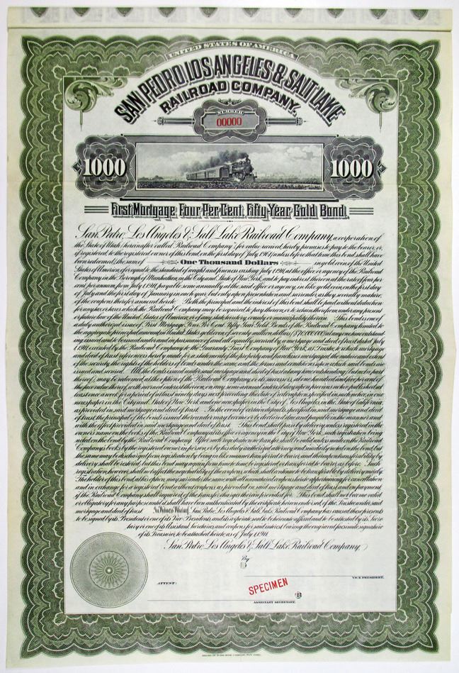 Utah 1911. $1000 Specimen 4% First Mortgage Gold Coupon Bond, Black text with olive border and undertint, Train passing on tracks in rectangular frame at top center. Red specimen overprints, 00000 serial number, and POCs. VF condition, ABNC. Only listed as a specimen in Cox, Rare.