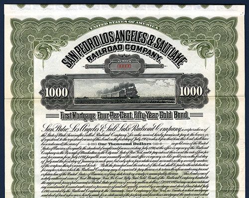 California & Utah, 1911, $1000, 1st Mortgage 4% 50 Year Gold Specimen Bond, Vertical format, Coupons attached, POC's, VF condition, ABNC. Listed railroad but 1911 bond is unlisted in Cox.