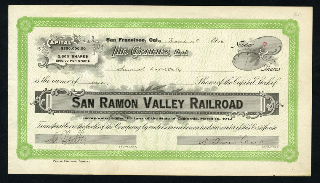 San Francisco, California. 1 Share, I/U, Black with green border, no vignette, S/N 7, VF-XF condition, Unlisted railroad in Cox. Rare and attractive California railroad. This is the stock certificate that is photographed in Cox. Very possibly unique.
