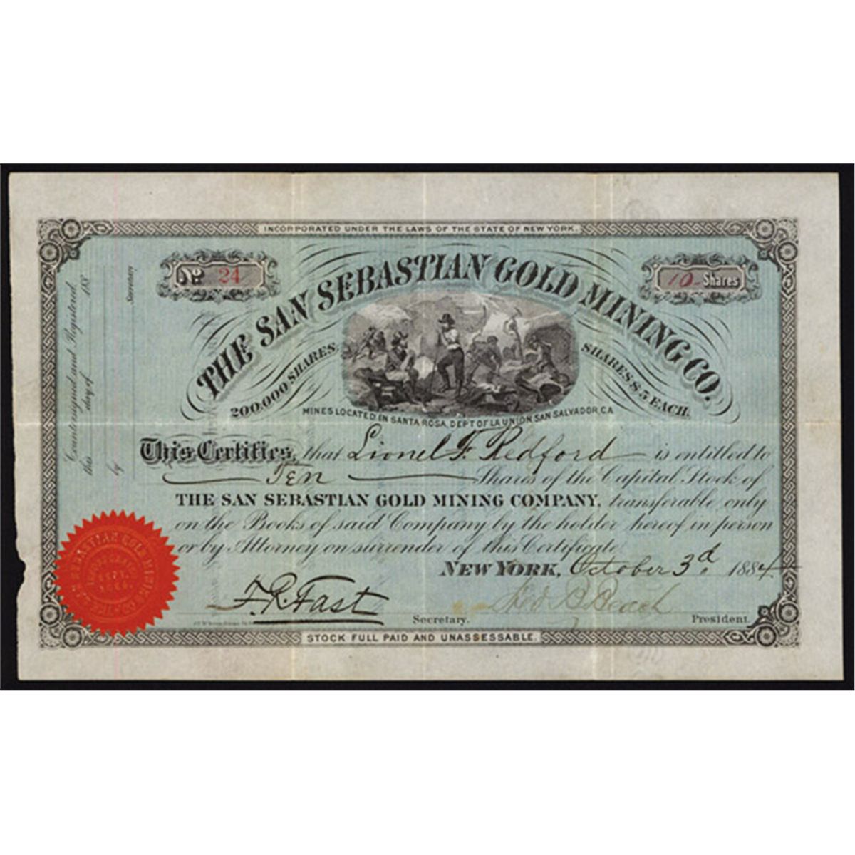 San Salvador, (Incorporated in New York), 1884, 10 Shares, Issued and uncancelled stock certificate, Black on light green underprint with view of miners working with mountains in background in middle. XF condition. Cert.#24, Scarce and very attractive mining stock.