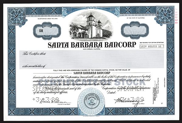 Santa Barbara, CA. Odd Shares, Specimen, Black on blue border, Santa Barbara Mission in middle, XF. Rare modern stock certificate. Jeffries BNC.