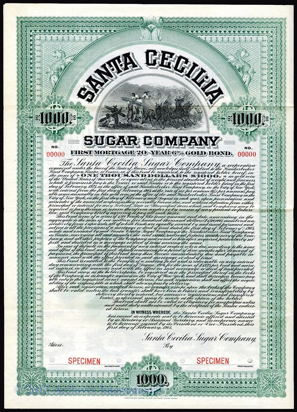 Santa Cecilia Sugar Co., 1905 Specimen Bond. 1905. $1000, Specimen 1st Mortgage 20 year 6% Gold Bond. Wagon being loaded with sugar cane being pulled by mules. Green border and undertint. Red SPECIMEN overprint and POC. Coupons attached. XF Condition. ABNC.