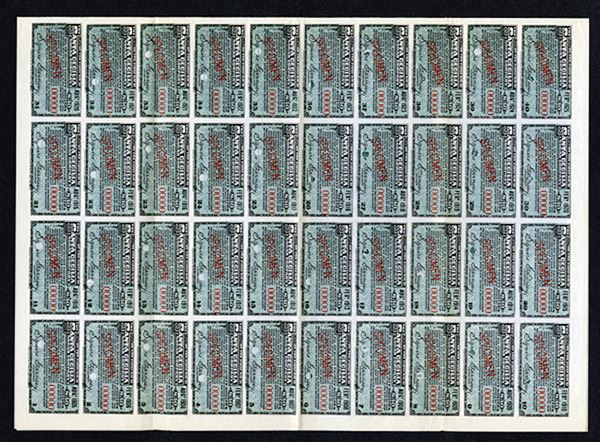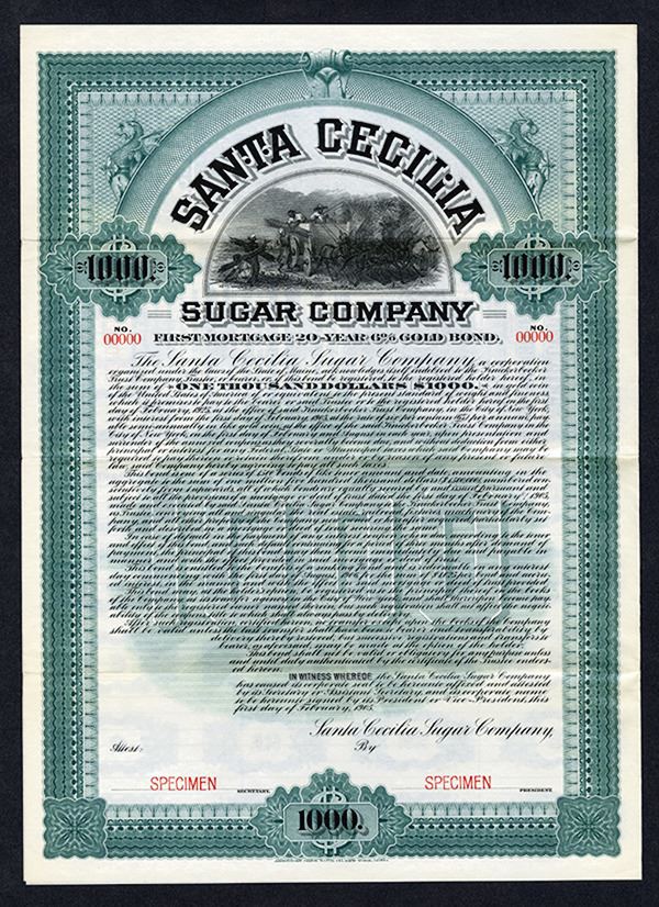 Maine. $1000 Specimen 6% First Mortgage 20 Year Gold Coupon Bond. Black print with an ornate green border and under tint. Vignette of a wagon being loaded with sugar cane being pulled by mules at top. Specimen overprints, POC's, XF Condition with all coupons attached. ABNC.