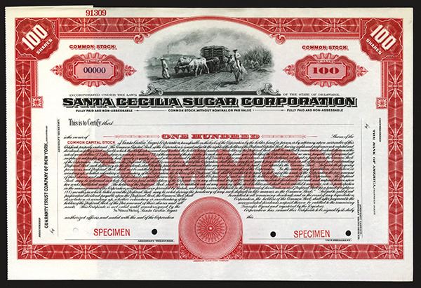 Cuba?. 100 Shares, Specimen, Black on red border and underprint, men with oxen pulled wagon with sugar cane, VF-XF. Very possibly Cuba related. Scarce sugar company certificate.
