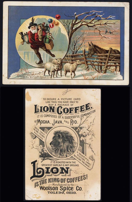 Toledo, Ohio, ND (ca.1890's), Multicolor Santa with gifts and animals; 6.75 x 4.5 inches, back side is a promotional ad for Woolson Spice Co.'s Lion Coffee. Corner bend top right and some mounting scuffs on back. Fine condition.