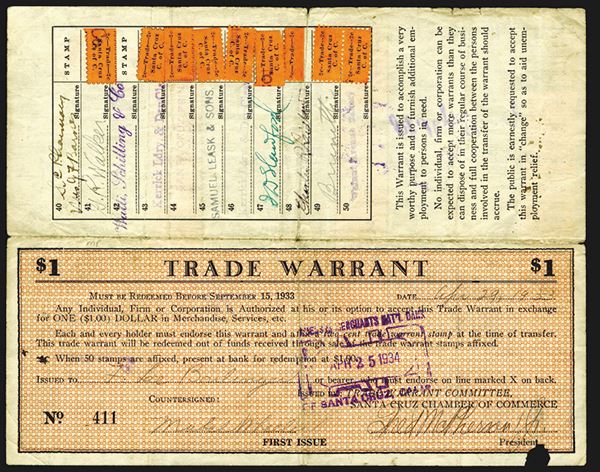 California. Depression script. Santa Cruz, CA. 1933. Trade warrant filled with 2c stamps and signatures and stamps of stores. $1. value now that it completely filled in. Paid stamped in 1934. Good to Very Good, extensively used.