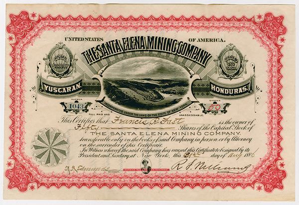 Yuscaran, Honduras (Inc. in New York). Mine located in Honduras. 50 Shares Capital Stock I/U Stock Certificate, Black print on red border, Ariel view of Honduras at top, VF-XF condition with minor toning at edges, Kendall BNC.