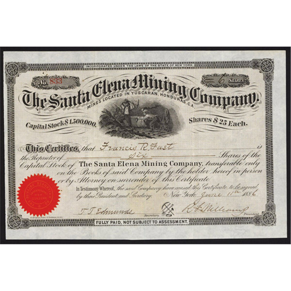 Yuscaran, Honduras, (Incorporated and issued in New York), 1886, 6 Shares, Issued and uncancelled stock certificate, Black on light red underprint with miners under title. Red corporate seal, “Mines Located in Yuscaran, Honduras, C.A.”, XF condition. Scarce and very attractive mining stock.
