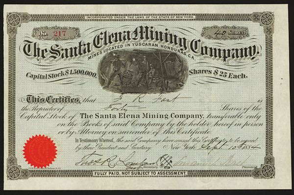 Yuscaran, Honduras, (Incorporated and issued in New York), 1884, 40 Shares, Issued and uncancelled stock certificate, Black on light green underprint with miners under title. Red corporate seal, "Mines Located in Yuscaran, Honduras, C.A.", XF condition. Scarce and very attractive mining stock.