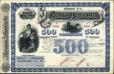 18--, ca.1870's-90's. 100; 500 Pesos. 2 different Specimen Serie 7% Bond. Blue or orange border. Allegorical woman with globe and child on left and running wild horse in middle beneath ornate title with cactus. Red specimen overprints, POC's and "00000" serial numbers. VF condition. Coupons attached. Rare Chilean bond. ABNC.