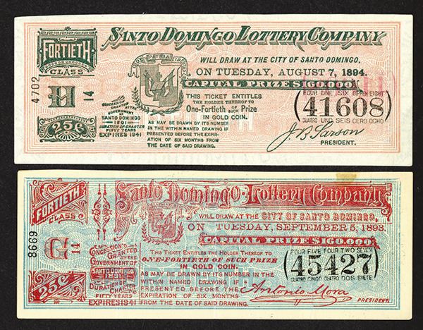 Dominican Republic, 1893, 1894 Lottery Tickets. Fine +. 2 pieces.