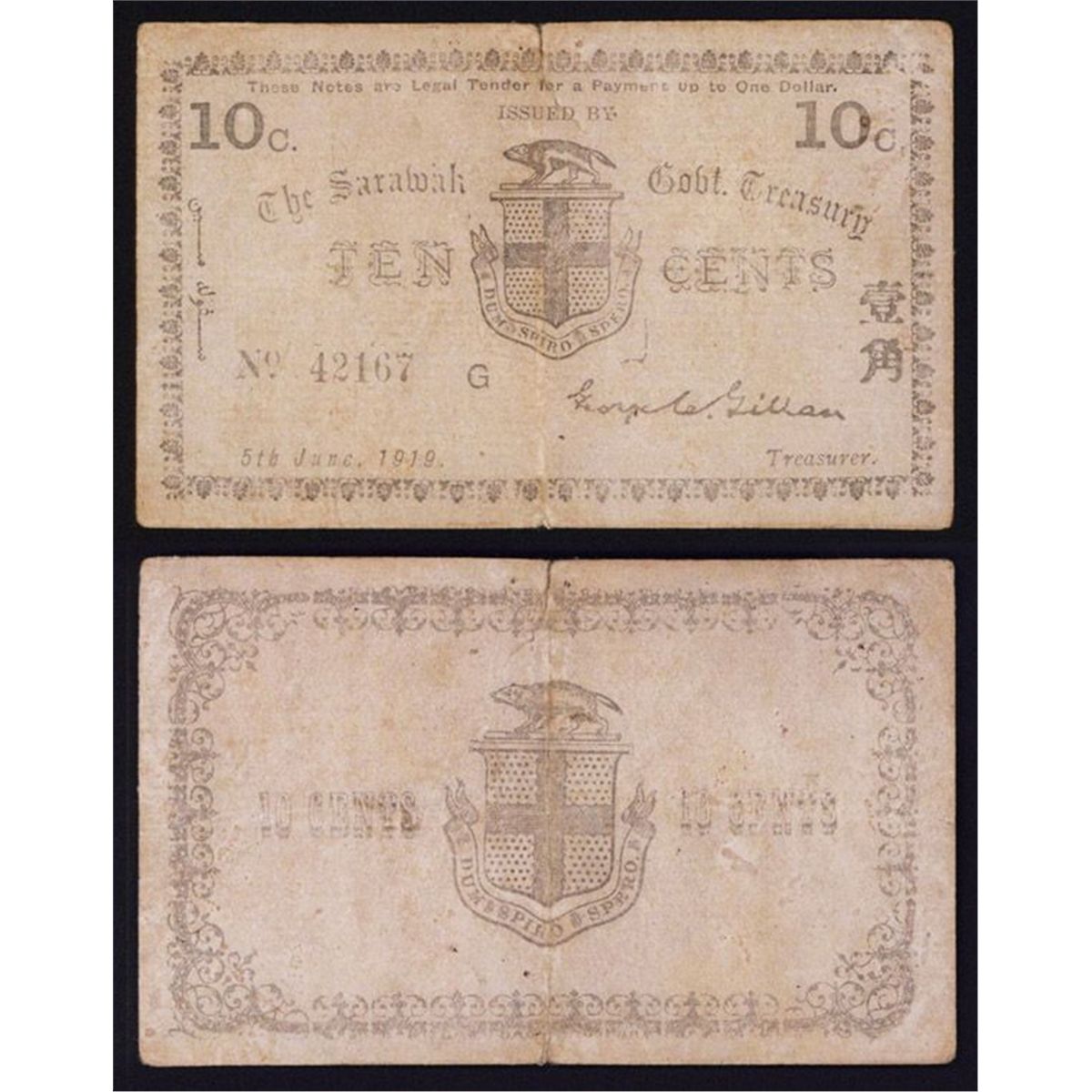 Sarawak, Fifth June 1919, 10 cents, P-7, Issued banknote, black with no underprint, arms in middle, back with arms with Tasmanian Devil, badger or wolverine, VF with a strong vertical-middle fold with a small tear in top middle margin fold, Pin holes, S/N 42167 G. Rare note in any condition and this is a very desirable note that is rarely seen in auction and the first time handled by us.