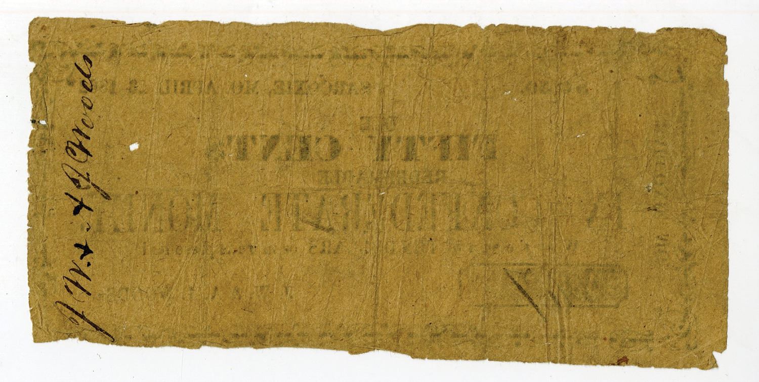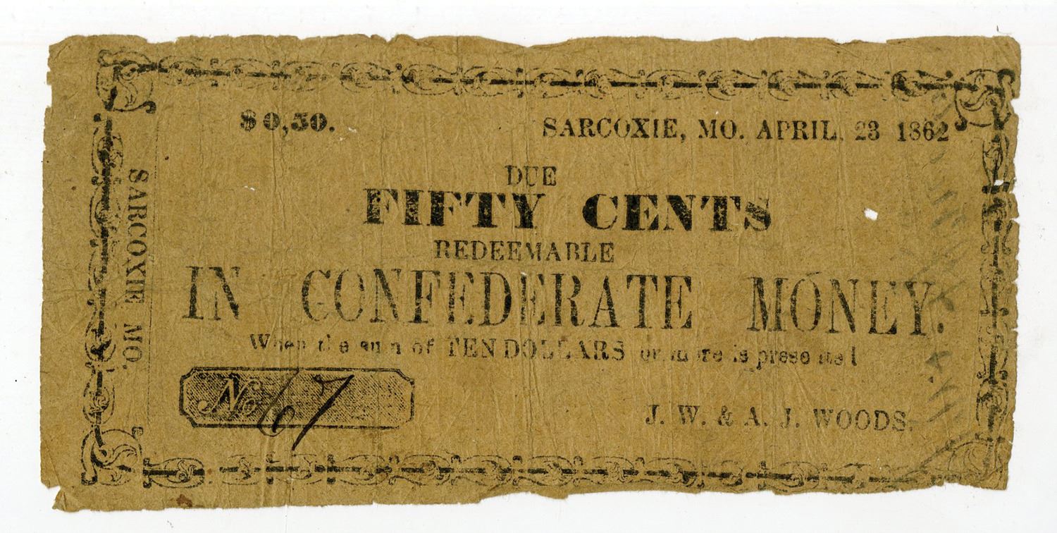 Sarcoxie, Jasper County, Missouri. 1862, J.W. & A.J. Woods. 50 Cents, Unlisted denomination, Issued obsolete scrip note, Dated April 23rd, 1862, "Redeemable in Confederate Money", Black text with black border, Signature on back in black, S/N 67, Fine to Choice Fine condition with rough edges. Extremely rare note with a similar design note with a $2.50 denomination offered in 2017, with no other examples seen.
