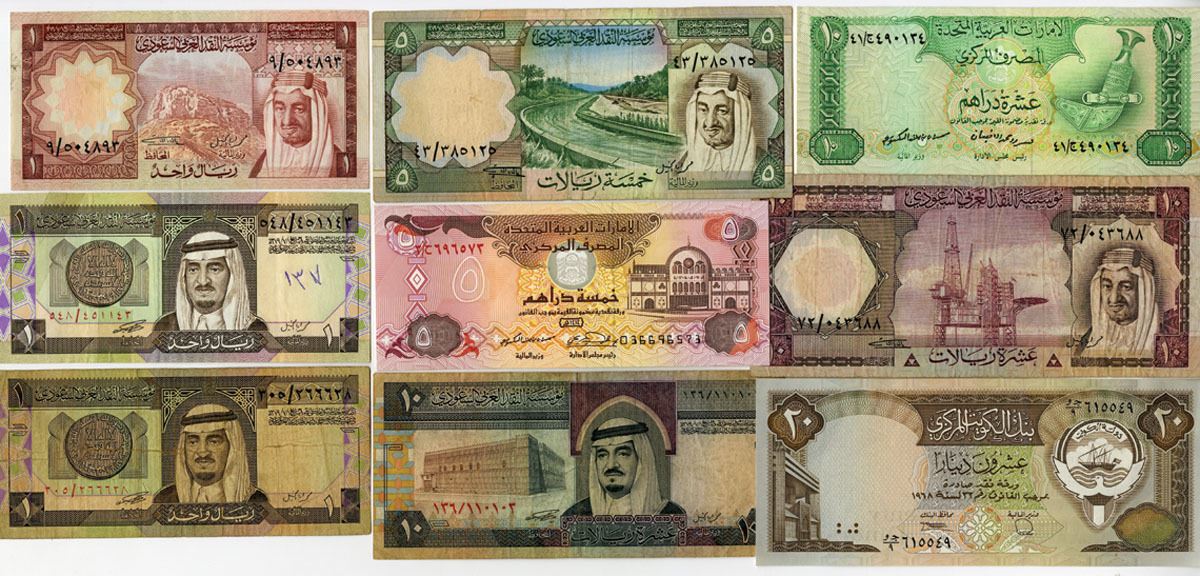 Saudi Arabia, Kuwait, & U.A.E., 1977-2006. Lot of 9 Issued Banknotes, Includes: Saudi Arabian Monetary Authority 1 Riyal, P-16, 1977, Fine-VF; 5 Riyals, P-17, 1977, Fine-VF; 10 Riyals, P-18, 1977, Fine-VF; 1 Riyal, P-21 (2), 1983, Fine-VF; 10 Riyals, P-23, 1984; United Arab Emirates Central Bank 10 Dirhams, P-8a, ND (1982); 5 Dirhams, P-12a, 1993; Central Bank of Kuwait 20 Dinars, P-16b, L.1968 (1986-91). Notes range from Fine to AU condition. (9). Sold "AS IS" no returns accepted.