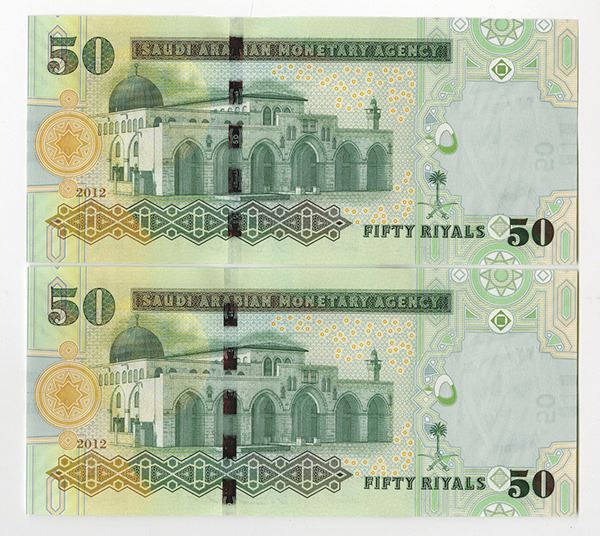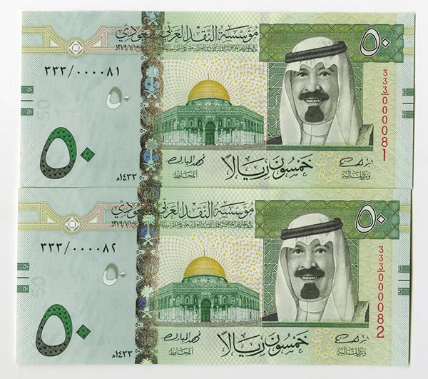 Saudi Arabia, sequential pair of issued 50 Riyals, AH1433, P-34c, serial numbers 000081 and 000082. Gem Uncirculated.