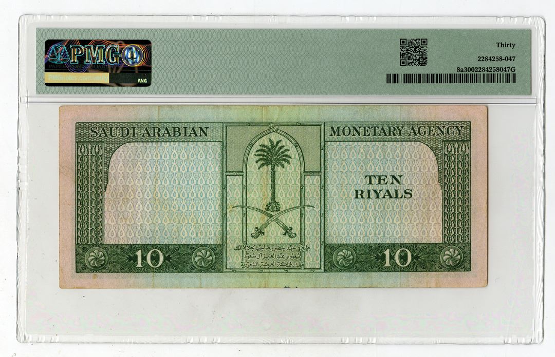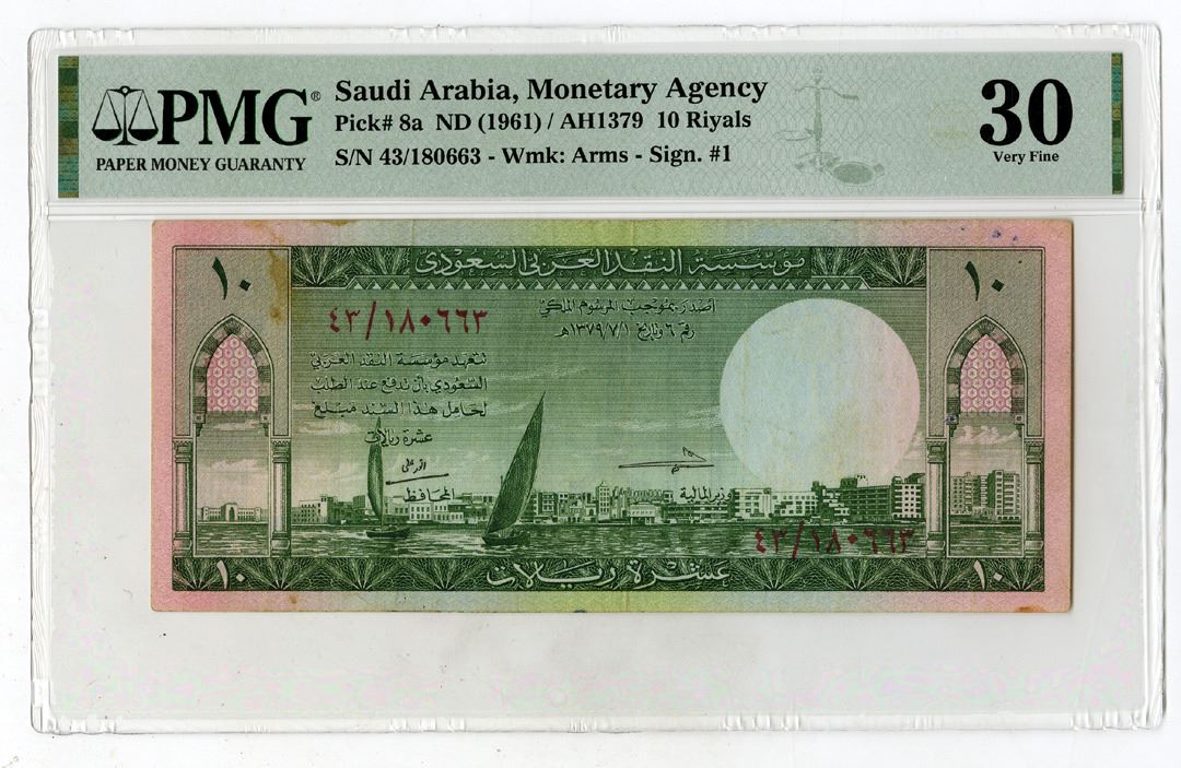 Saudi Arabia, ND (1961)/AH1379. 10 Riyals, P-8a, Issued Banknote, Green on pink and pale green underprint, Dhows in Jedda harbor on face, Back is green on m/c with Arms at center, S/N 43/180663, PMG graded Very Fine 30.