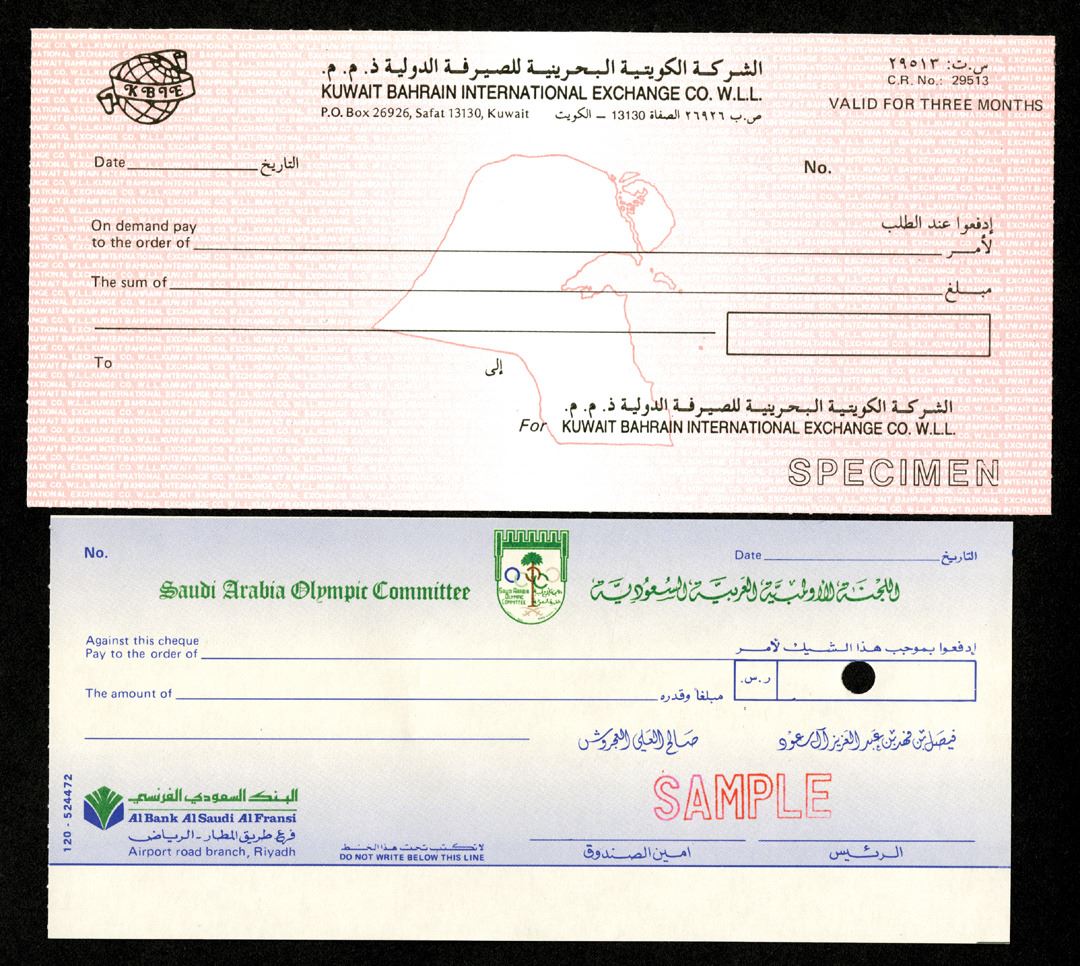 Kuwait, Saudi Arabia, ND (ca.1980s). Two Specimen Checks. One with Olympic theme. POCs and SPECIMEN overprints. Choice Uncirculated. 2 pieces.