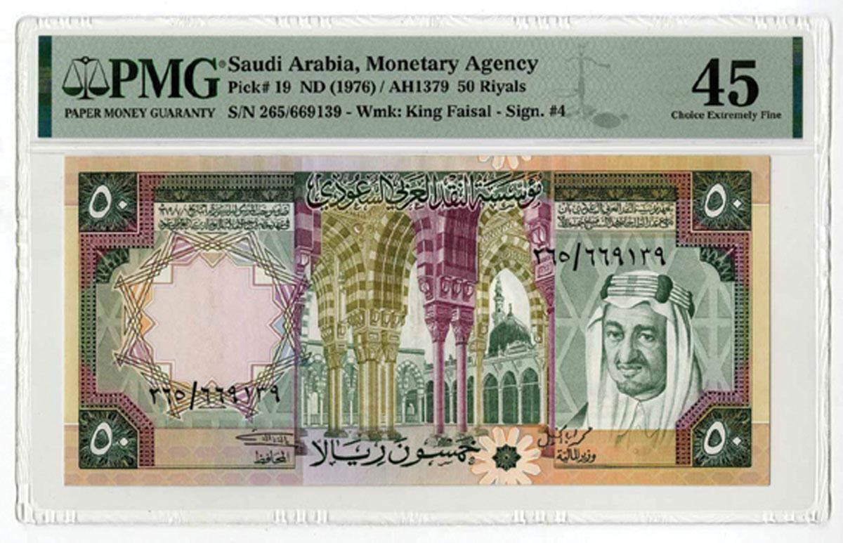 Saudi Arabia, ND (1976)/AH1379. 50 Riyals, P-19, Issued Banknote, Green purple and brown on m/c underprint with portrait of King Faisal at right, Back is green on m/c with mosque courtyard at center, S/N 265/669139, PMG graded Choice Extremely Fine 45.