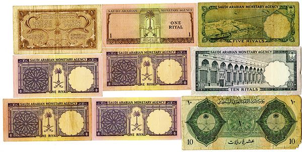 Saudi Arabia. Lot includes an assortment of 1 Riyal, 5 Riyal, and 10 Riyal notes from earlier issues. P-2; 4; 6; 11a (3); 11b; 12a; 13a. P-4 is VG with rough edges, the rest Fine to Choice VF. (9)