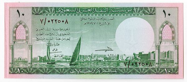 Saudi Arabia. Issued 10 Riyals, AH1379, P-8a, Choice Uncirculated and thus scarce.