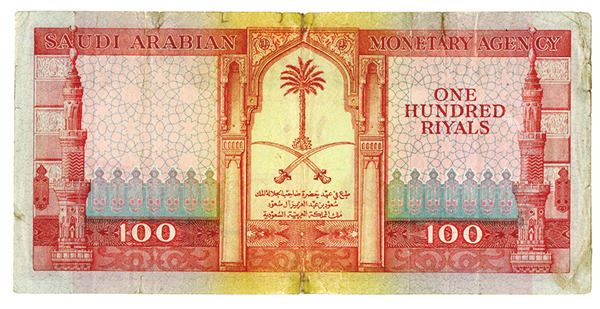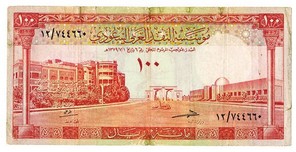 Saudi Arabia. Issued 100 Riyals, AH1379, P-10a. Fine with tears and staple holes.