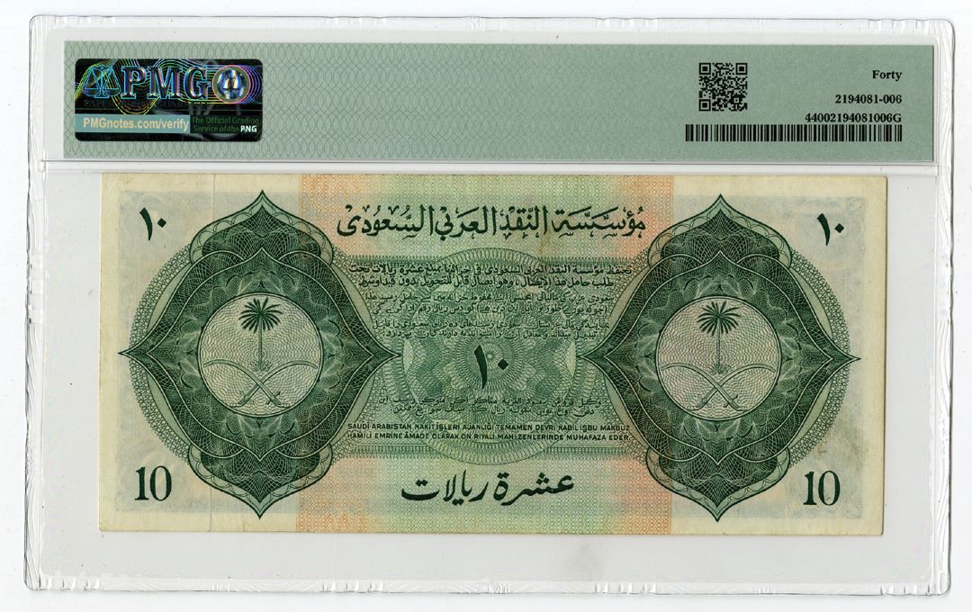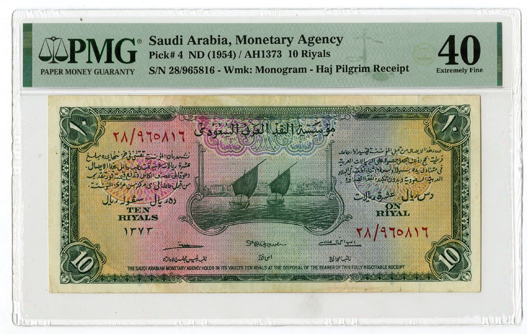Saudi Arabia, ND(1954)/AH1373. 10 Riyals, P-4, Issued Banknote, Green and m/c underprint with Dhows sailing off shoreline at center, S/N 28/965816, PMG graded Extremely Fine 40.