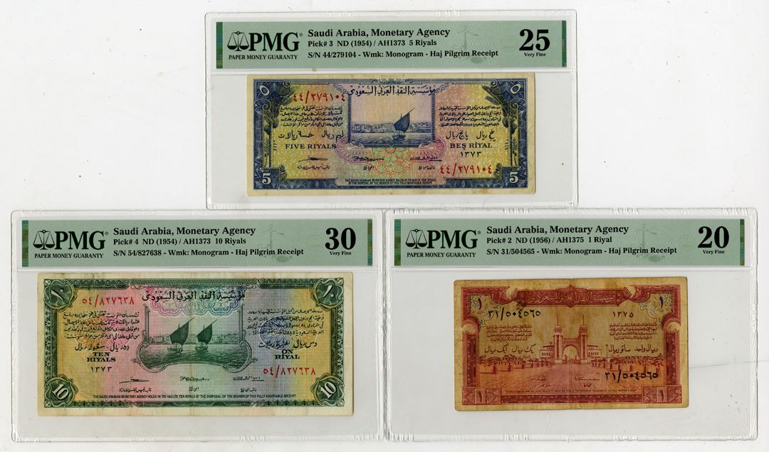 Saudi Arabia, ND(1954)-ND(1956). Lot of 3 Issued Banknotes, Includes: 1 Riyal, P-2, S/N 31/504565, PMG graded Very Fine 20; 5 Riyals, P-3, S/N 44/279104, PMG graded Very Fine 25; 10 Riyals, P-4, S/N 54/827638, PMG graded Very Fine 30. (3). Sold "AS IS" no returns accepted.