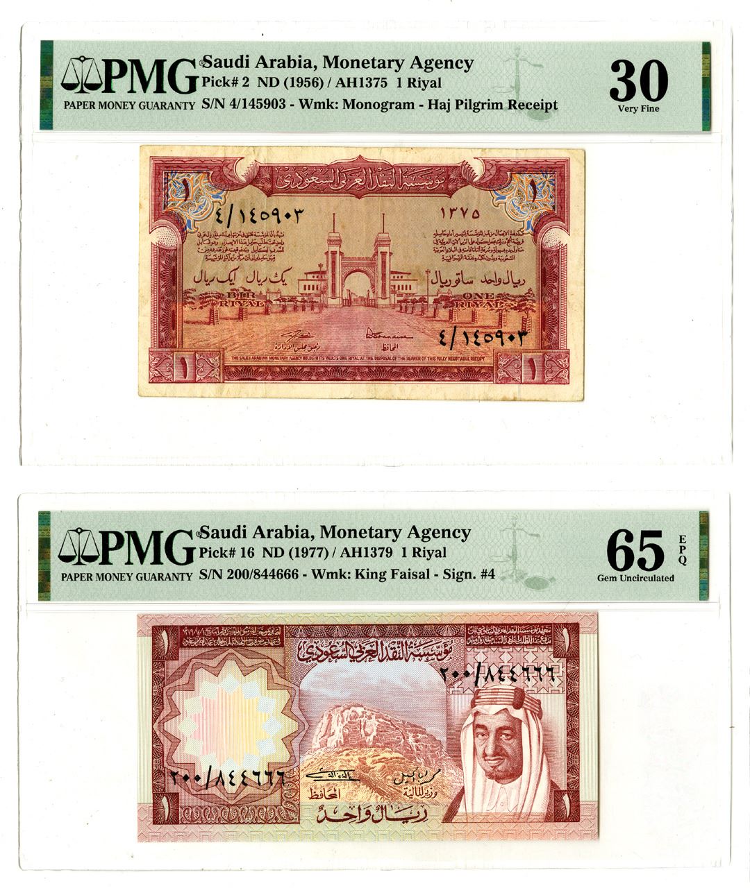 Saudi Arabia, ND(1956)/AH1375-ND(1977)/AH1379. Lot of 2 Issued banknotes, Includes: ND (1956), 1 Riyal, P-2, PMG graded Very Fine 30; and, ND (1977), 1 Riyal, P-16, PMG graded Gem Uncirculated 65 EPQ. (2).