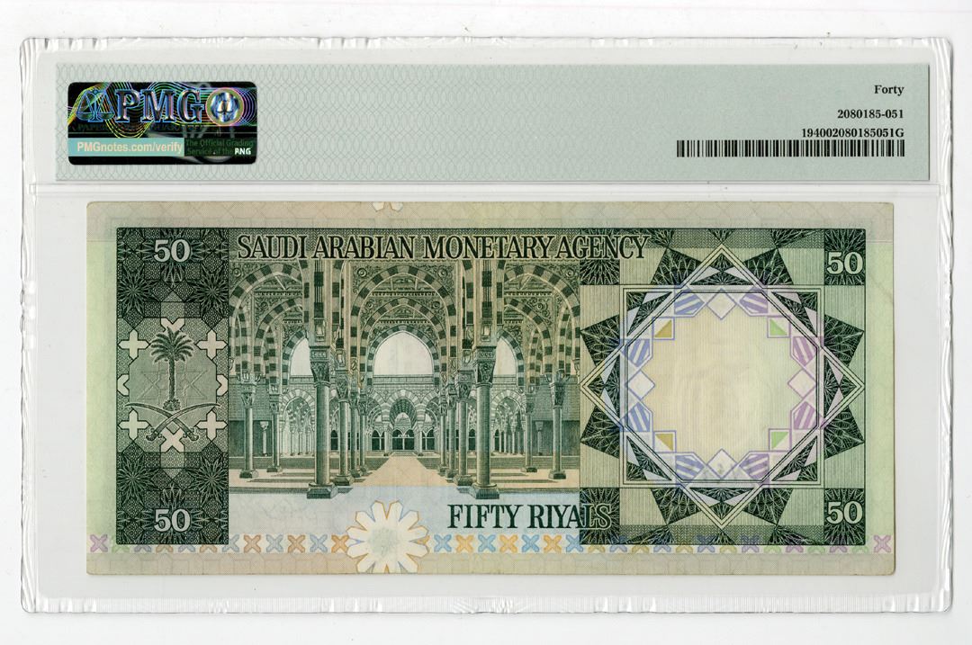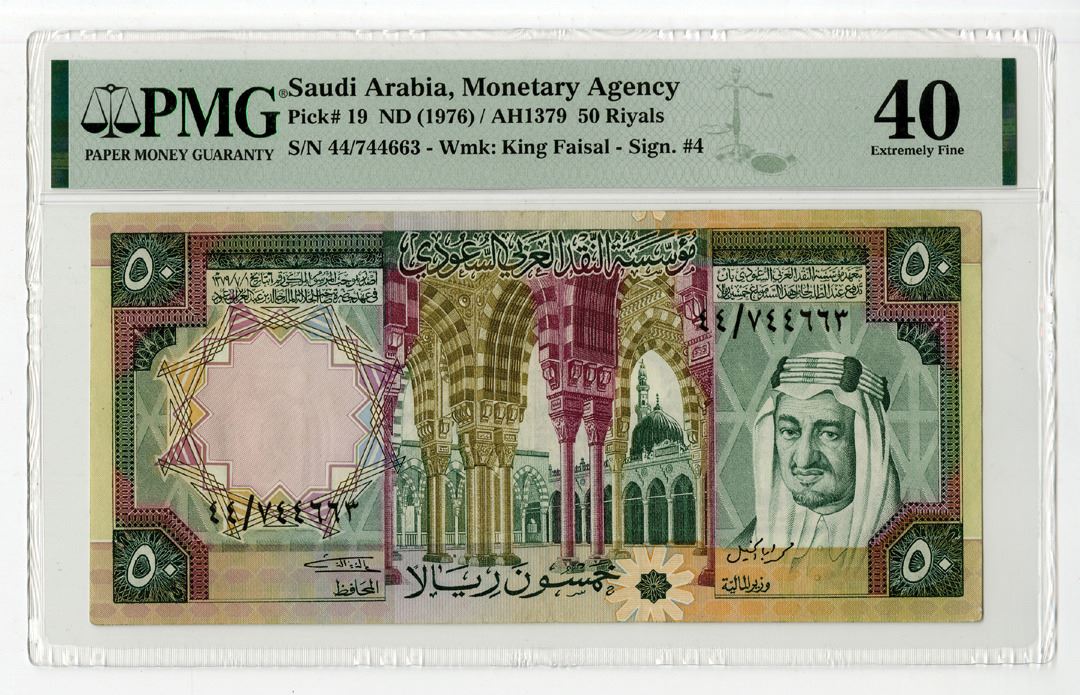 Saudi Arabia. ND (1976)/AH1379. 50 Riyals, P-19, Issued banknote, Green and olive on multicolor underprint, S/N 44/744663, Watermark: King Faisal, Sign. #4, PMG graded Extremely Fine 40.