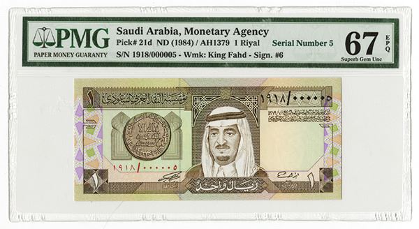 Saudi Arabia. Issued 1 Riyal, ND (1984), P-21d, signature 6, serial number 000005, PMG Superb Gem Unc 67 EPQ. Rare with low serials.