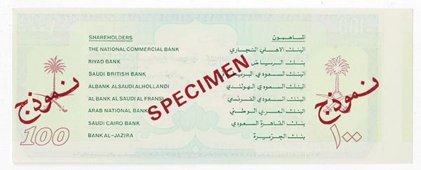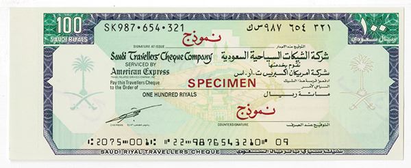 Saudi Arabia. Specimen Traveler's Cheque, 100 Saudi Riyals, serviced by American Express, featuring Saudi arms consisting of palm tree and crossed swords flanking center text at each side, overprinted SPECIMEN and _____ Choice Uncirculated.