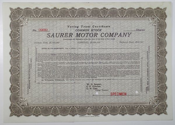 New Jersey, 1911, Odd Shares Specimen Voting Trust Capital Stock Certificate, Black text with brown border and background. Red specimen overprint, 00000 serial number, and POCs. VF condition, ABNC. The Saurer Motor Company was an American commercial vehicle manufacturer that manufactured trucks under a license from the former Swiss manufacturer Adolph Saurer AG. Rare specimen stock certificate.