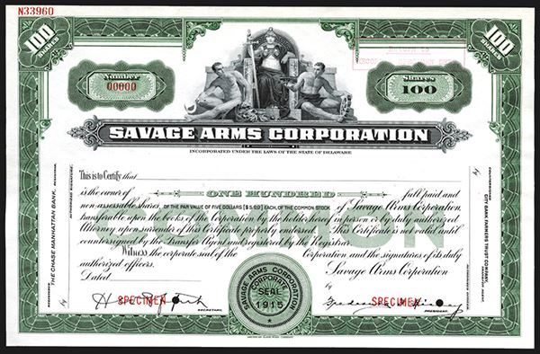 100 Shares, Black on green border and underprint, Allegorical woman with sword flanked by two men, VF-XF condition, Scarce certificate from this well known gun maker. ABNC.