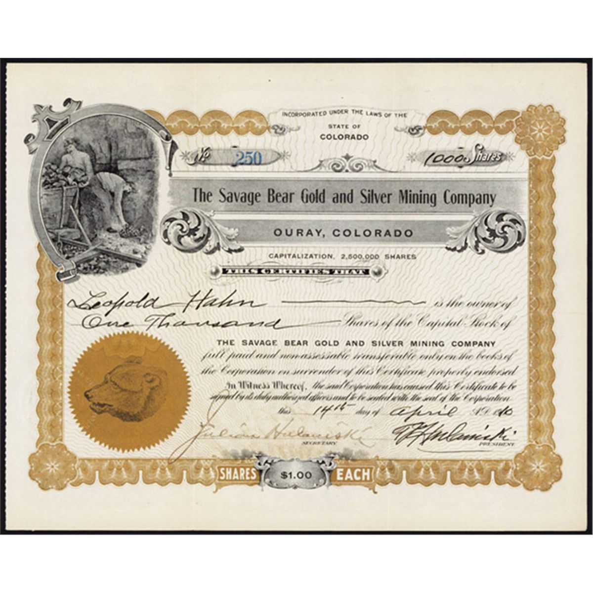 Colorado, 1910, 1000 Shares, #250, Issued and Uncancelled Stock certificate, Gold border with Mining scene vignette on top left, Gold Company Seal with Bear imprint, VF condition. Attractive and interesting design.