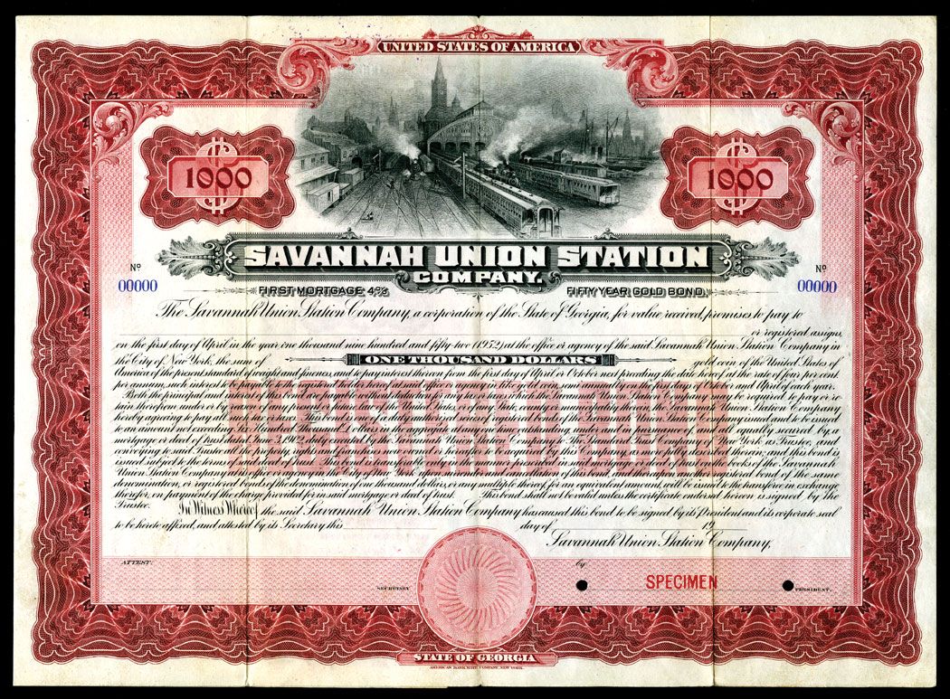 Savannah, Georgia, $1000, 1st Mortgage 4% Registered Gold Bond. Plum border and undertint. Train leaving station. XF condition. Red specimen overprint and POC's. ABNC. Unlisted railroad related company in Cox.