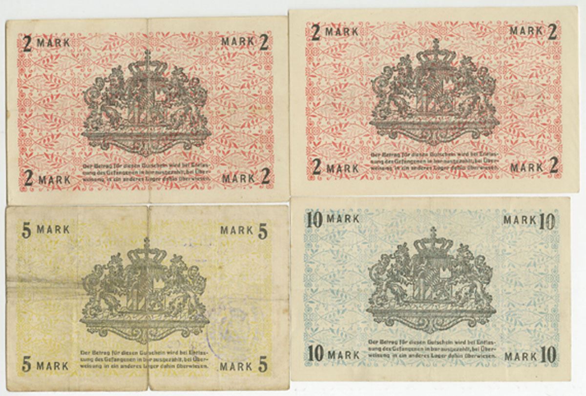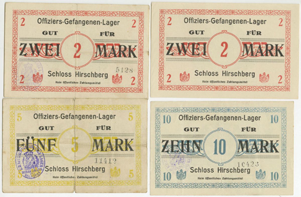 Schloss Hirschberg ,Germany. Lot of 4 P.O.W. Notes. Officer, Prisoner of War Notgeld Scrip Notes, includes 10 Mark, VF; 5 Mark, Fine w/split; and two 2 Mark notes, one VF and one AU+, the latter without validation handstamp. (4)