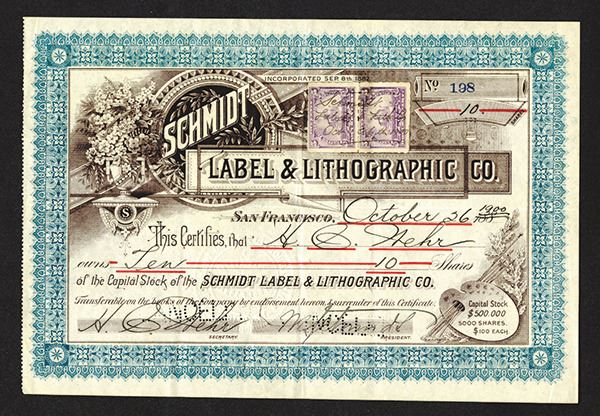 CA. 10 Shrs Stock Certificate. Issued. Cancelled. Nice. Documentary stamps at top center. VF+
